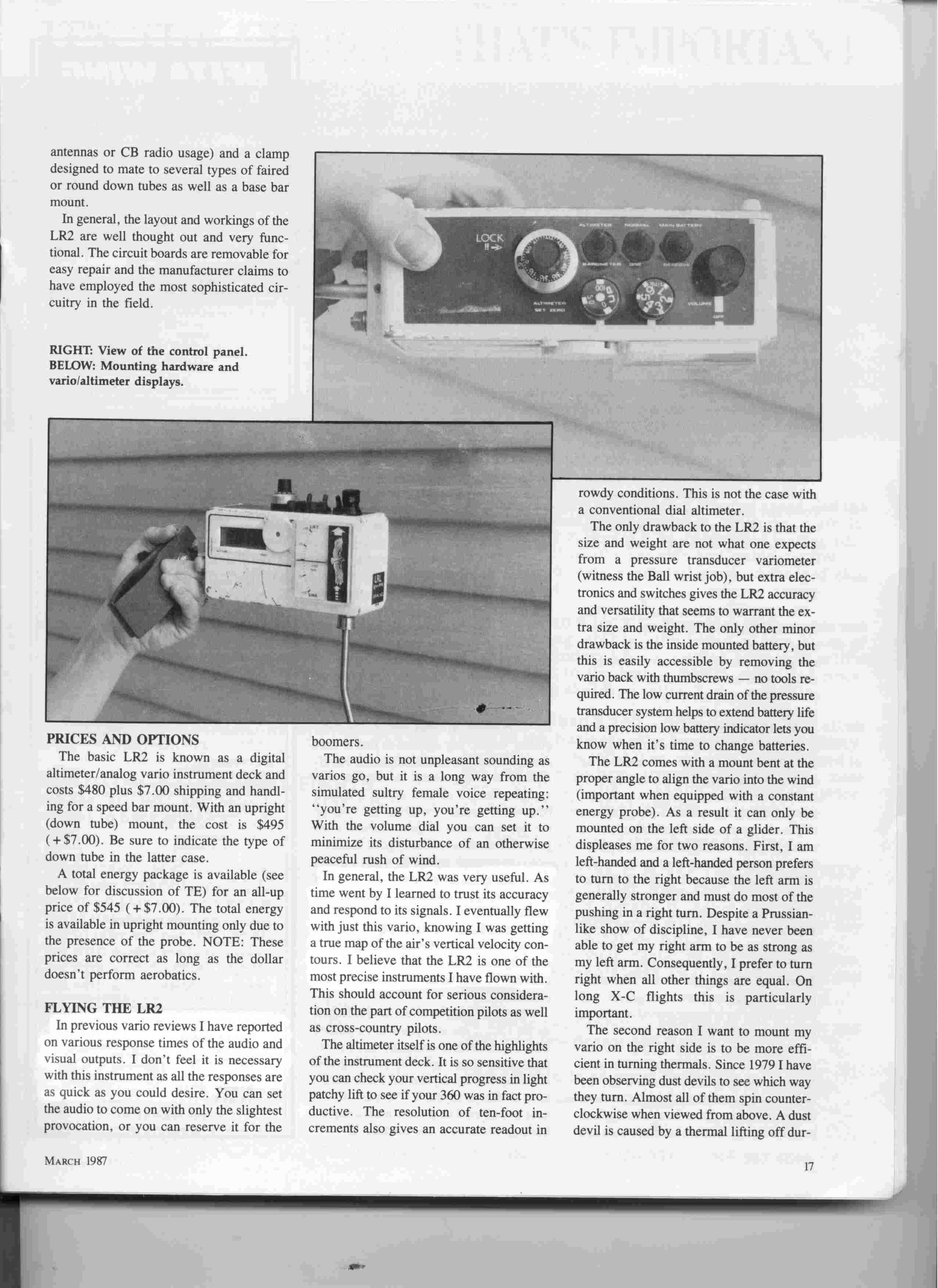 The LR2 preceded the LR3. Altimeter and vario performance were similar but the LR2 circuit boards were packaged in a functional rectangular box. (The LR3 also added more functionality such as the averager)